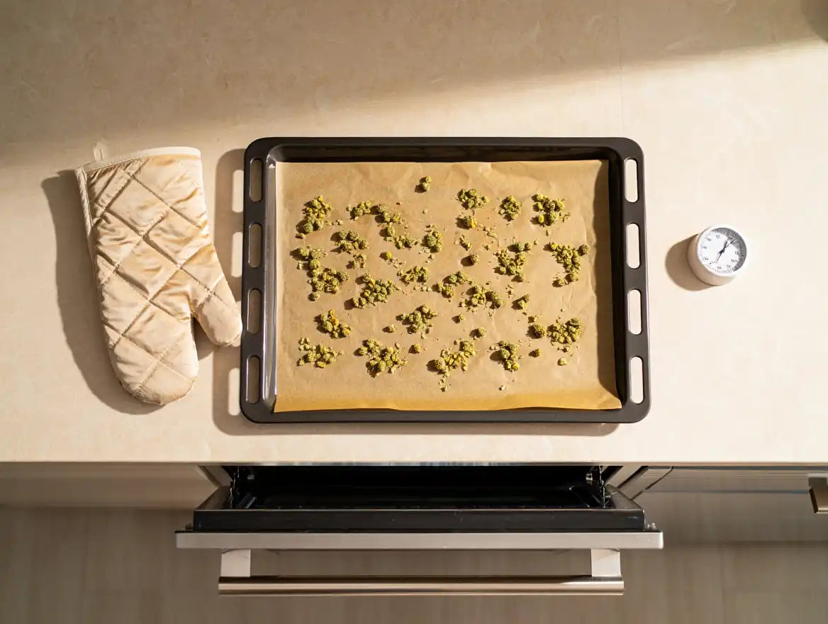 Rohes Cannabis entfaltet seine Inhaltsstoffe erst durch Erhitzen. Bei ca. 105–120 °C im Ofen, 30–40 Minuten lang, wird THCA in THC umgewandelt – erst dann kann der Körper es aufnehmen.